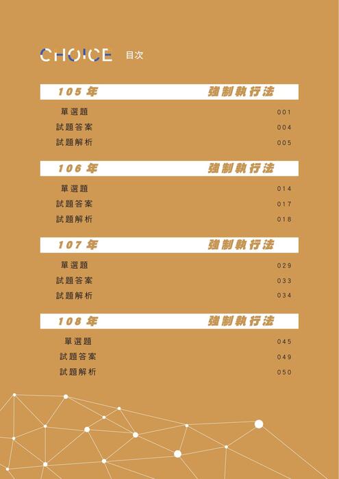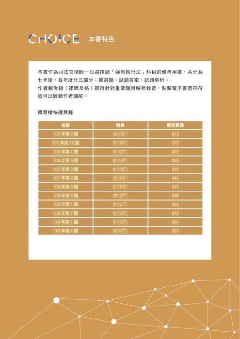 本書作為司法官律師一試選擇題「強制執行法」科目的備考用書,共分為七年度,每年度分三部分:單選題、試題答案、試題解析。