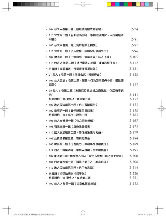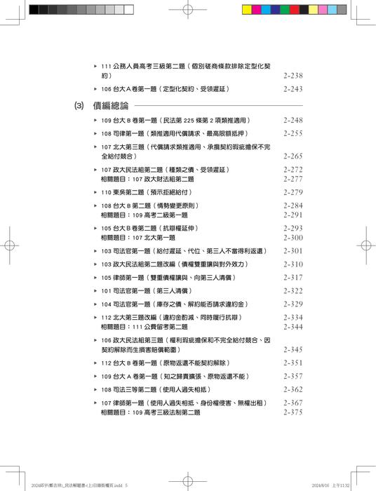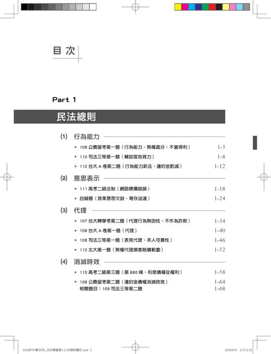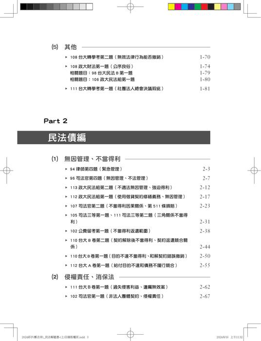 以民法總則、債法、物權、身分法為大架構章節,再以主題式細分各編具體命題來編排精選相關題目;非單純照年份排序!