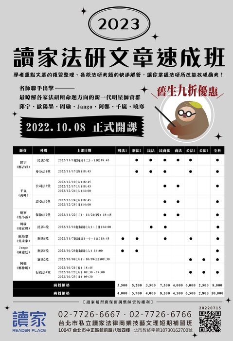 讀家法研班文章速成班幫你整理近幾年法研考題、近一年學者之文章、研討會等相關內容,並將各老師習慣的出題方式融入課程中,讓你事半功倍,考試準備的得心應手,不用再花好多時間整理文章、尋找重點!