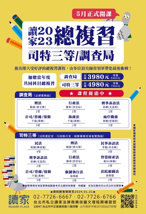 •適用考試:2023年司法三等考試-檢察事務官(偵查實務組)